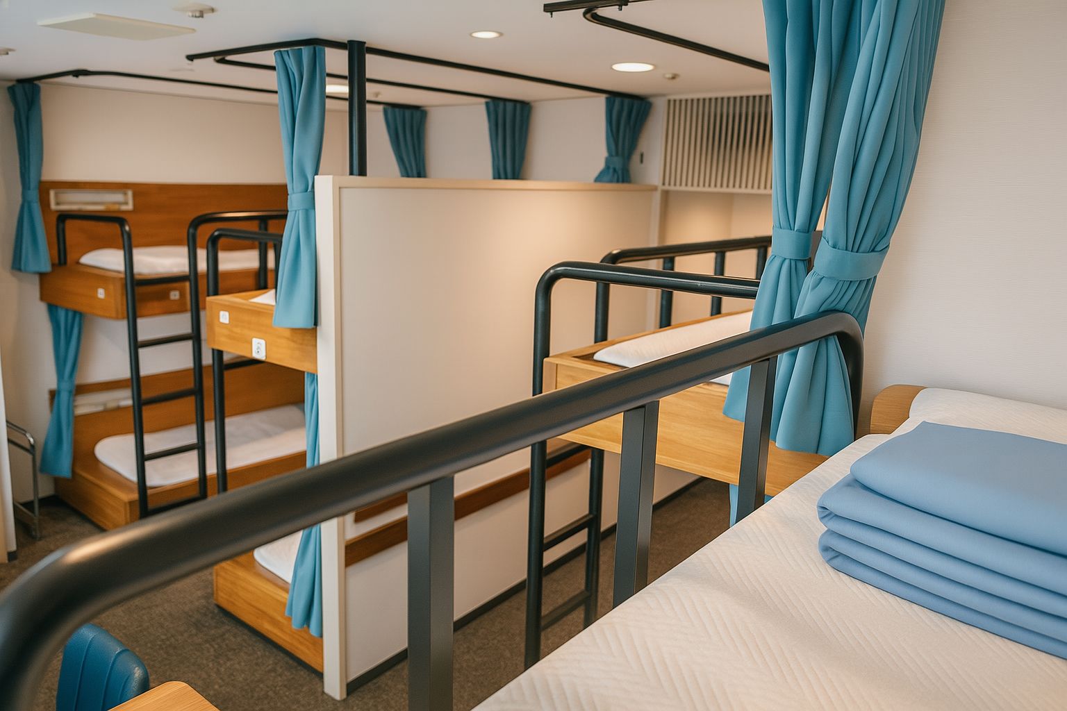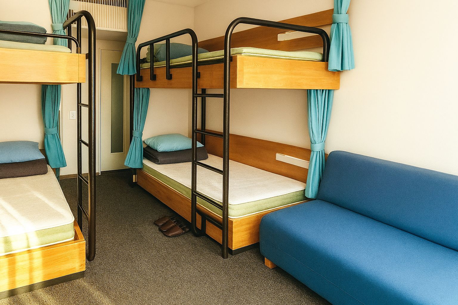 There are two bunk beds and one extra bed. A maximum of 5 people can stay in the room. More than 4 guests (if it is not crowded, than 3 people,) who are family or friends of the same gender, can use the room privately. Each bed has a bed lamp and curtain, so you can also have a private time (except for the extra bed).