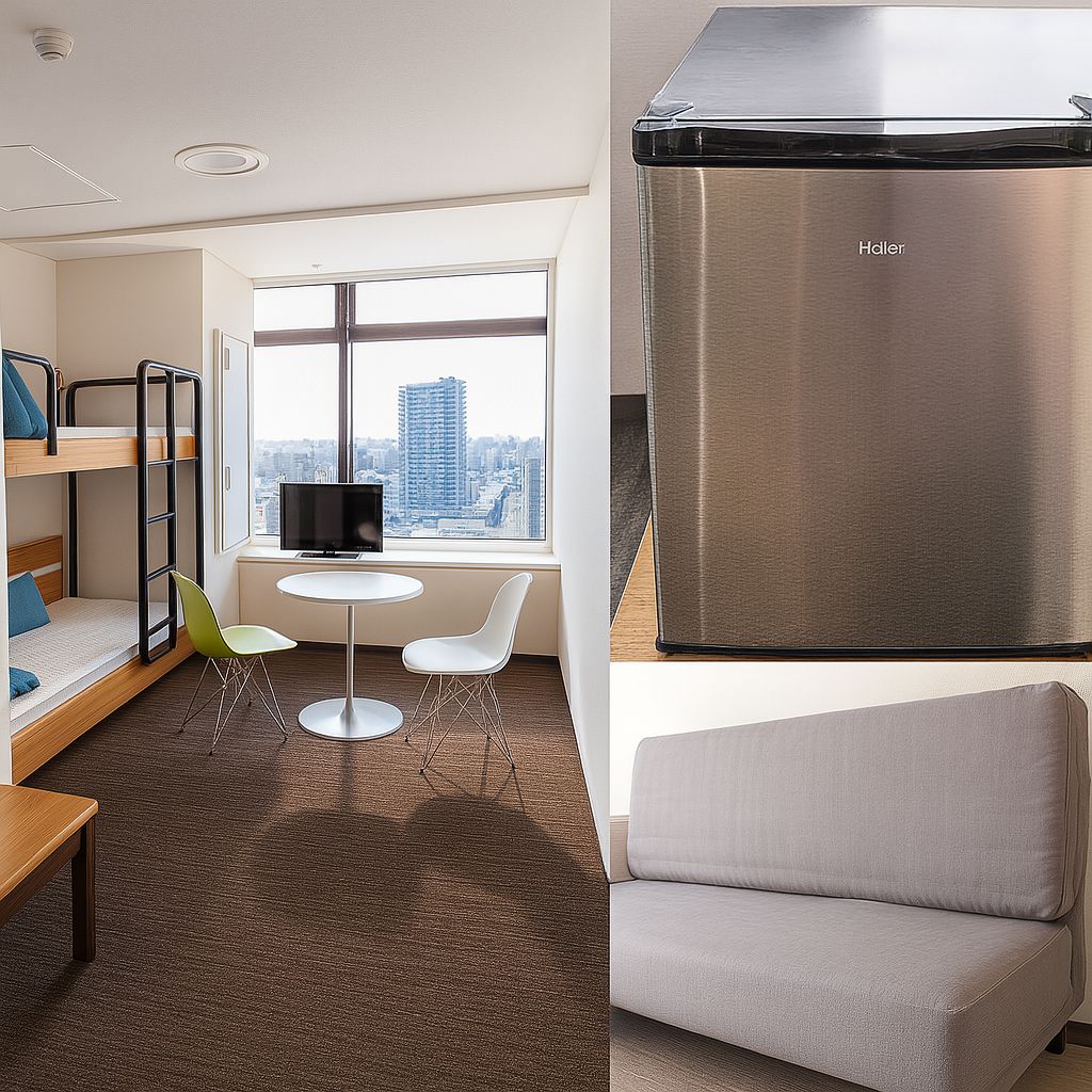 If your group consists of only two people, you will stay in gender-separated dormitory rooms with other guests. Reservations are made by bed. You will need to go up and down the ladder if you are assigned to an upper bunk. This room has twice the window size of rooms for four, which gives you a nighttime view of Tokyo.