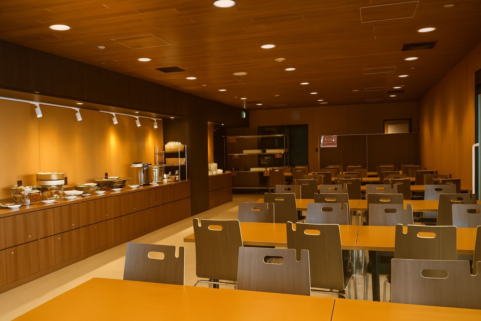 Meals are served in the dining room. It can accommodate sixty people. About a hundred people can sit at the same time, including the lounge next to the dining room.